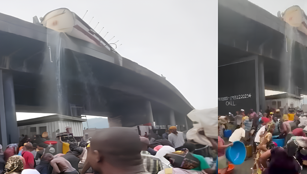 Danger on the Bridge: Residents Scoop Diesel After Tanker Crashes in Apapa